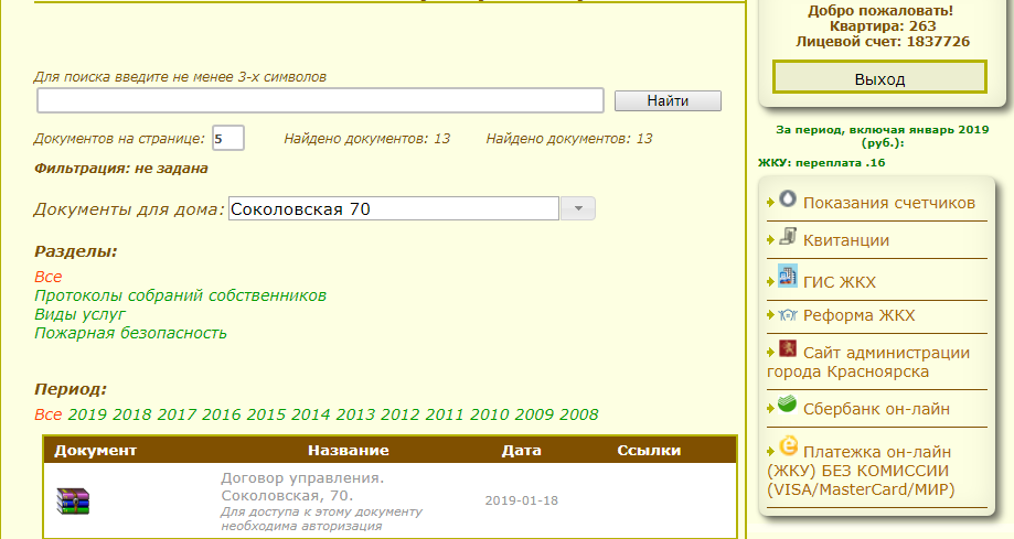Обращение #47: 27-02-2019(08:36) Соколовская 70, 263 Добрый день. Под моей учеткой нет возможности скачать договор управления из раздела "Мой дом (документы)". Написано: "Для доступа к этому дому необходима авторизация". | ||||||||