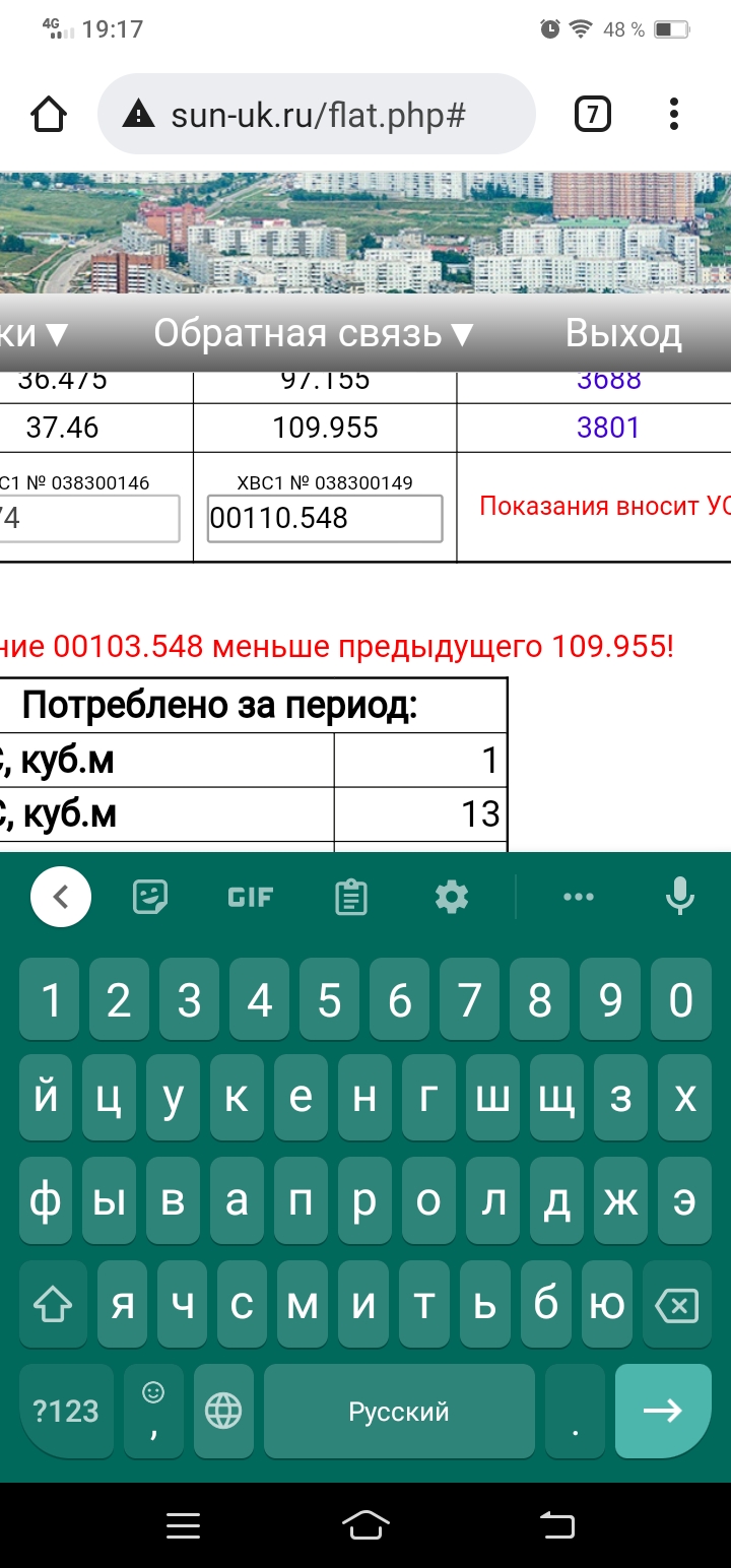 Обращение #46: 20-02-2019(16:50) Соколовская 70, 54 День добрый. Не получается скинуть показания | ||||||||