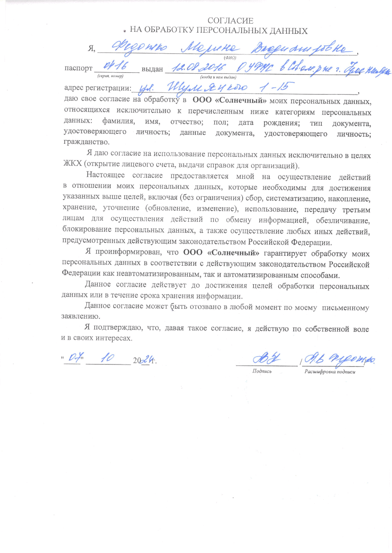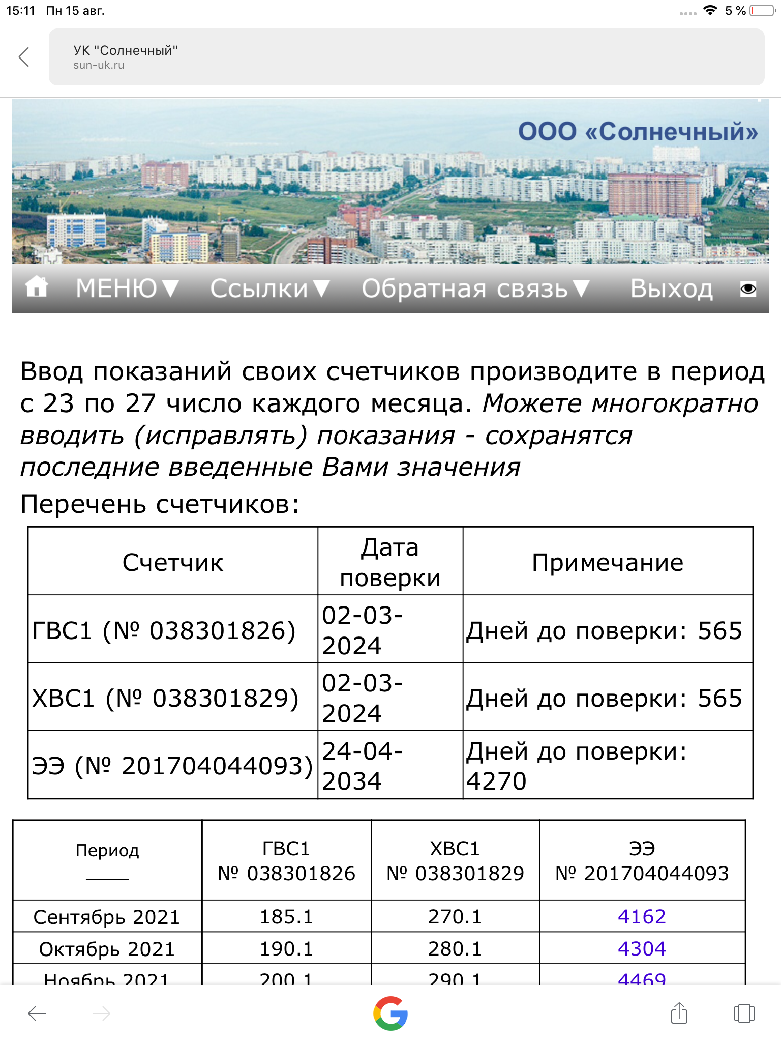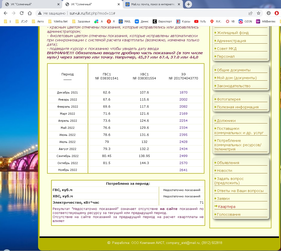 | Ответ:07-09-2018(11:06)Отвечено Добрый день! Конечно! С 23 числа и по последнее число месяца Вы можете вносить показания через сайт, а именно показания по горячему и холодному водоснабжению, на показаниях по электричеству стоит блок, так как их собирает наш сотрудник. Для Вашего удобства, все описано в памятке. С уважением, ООО "Солнечный". Прикрепленные файлы: