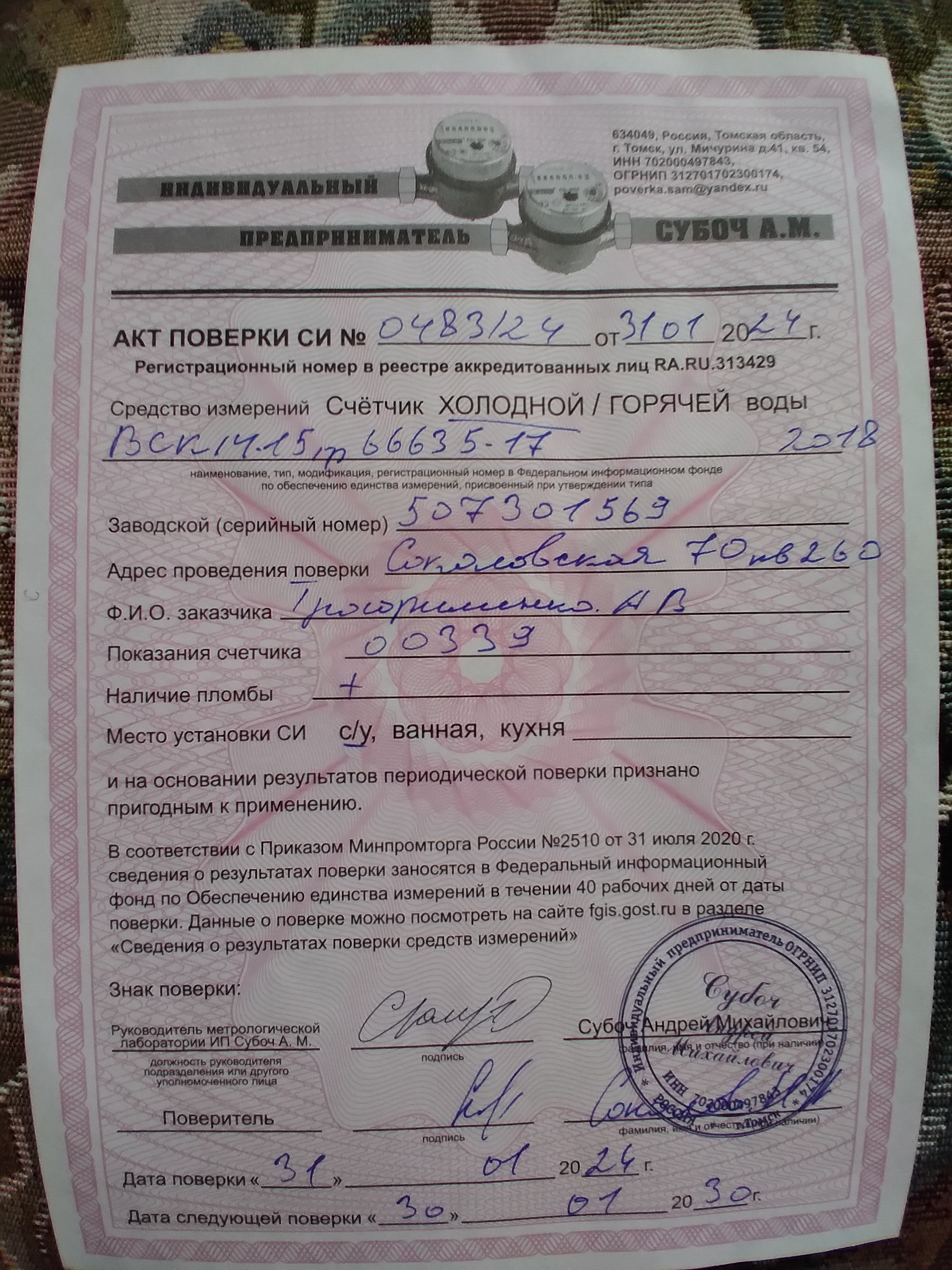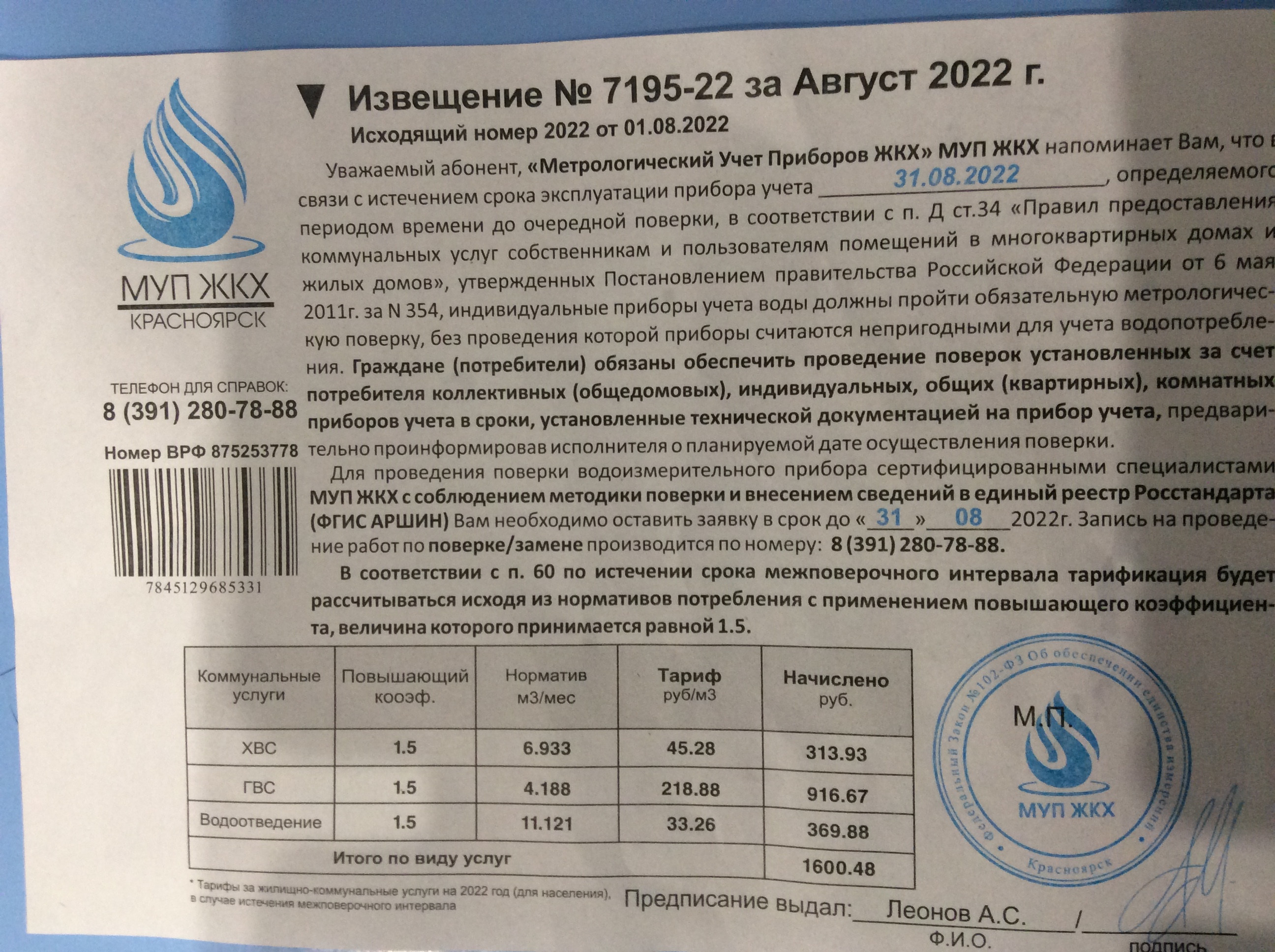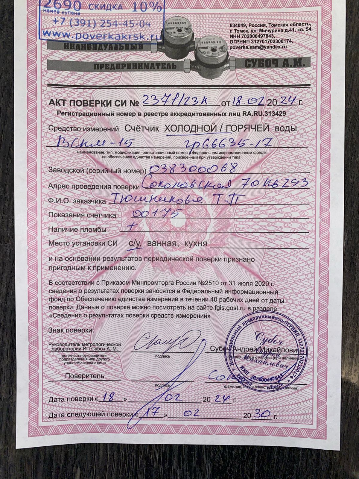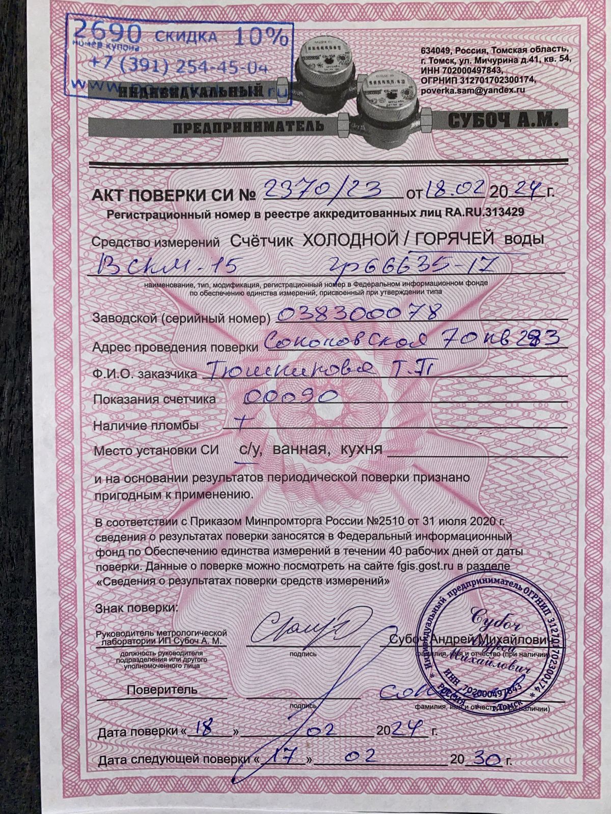 | Ответ:15-01-2019(17:56)Отвечено Добрый вечер Уважаемый Собственник! /> Информация не является актуальной, но для того чтобы установить точную дату поверки Ваших индивидуальных приборов учета, предоставьте пожалуйста в офис компании паспорта на Ваши счетчики. | ||||||||
