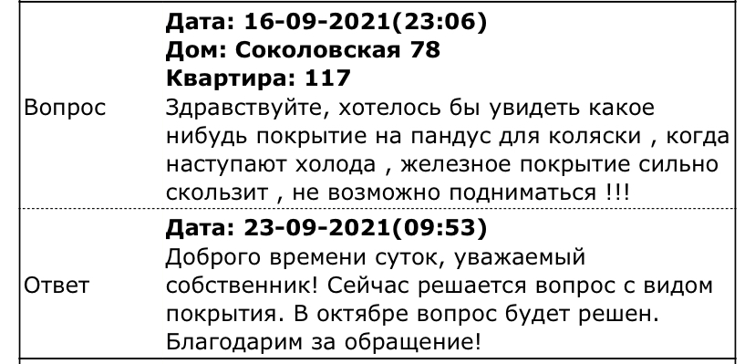 Обращение #1259: 17-01-2026(16:39) Соколовская 78, 178 Здравствуйте , в связи с тем что дворник не чистить крыльцо подъезда он сейчас обледенело и очень скользко . Возьмите в работу почистить механически крыльцо и посыпать , чтобы не прдскальзываться. | ||||||||