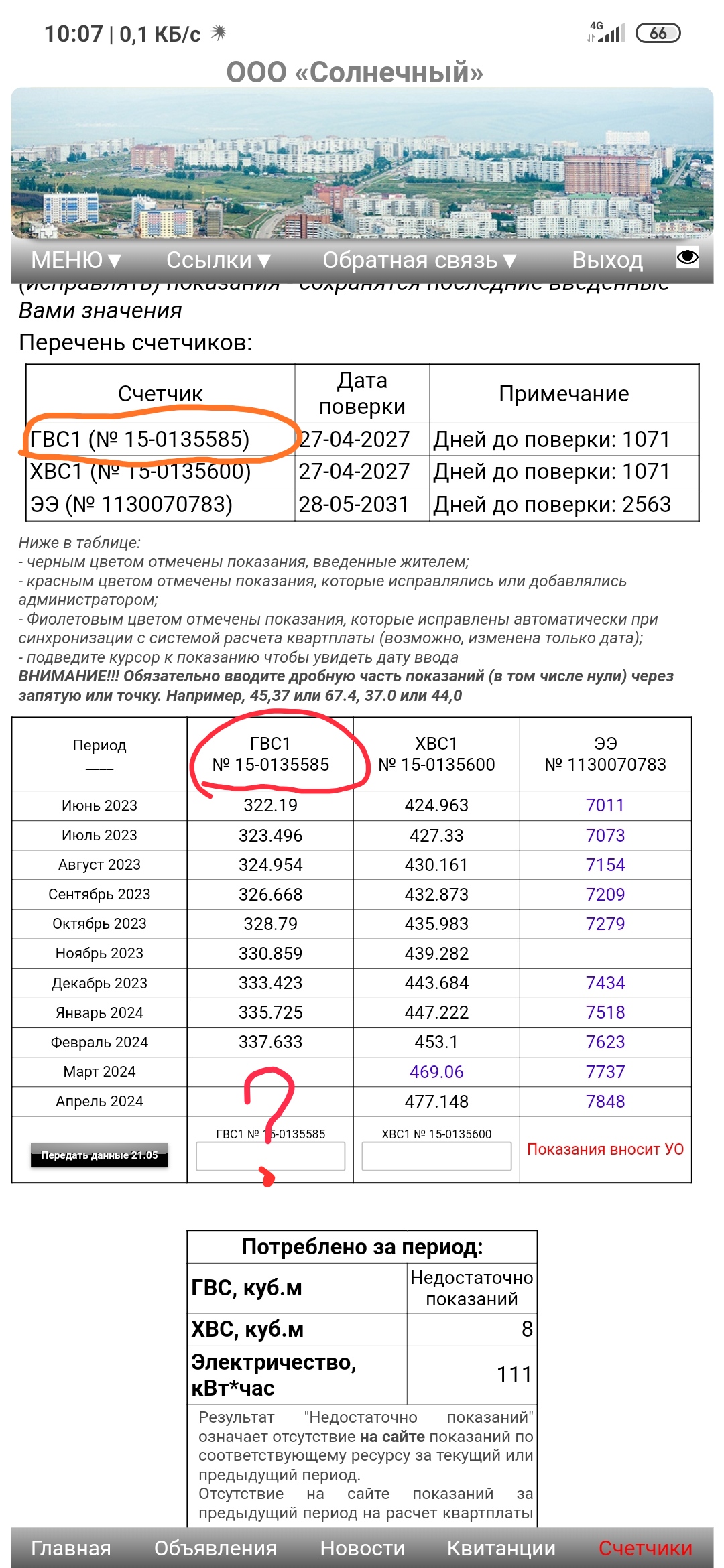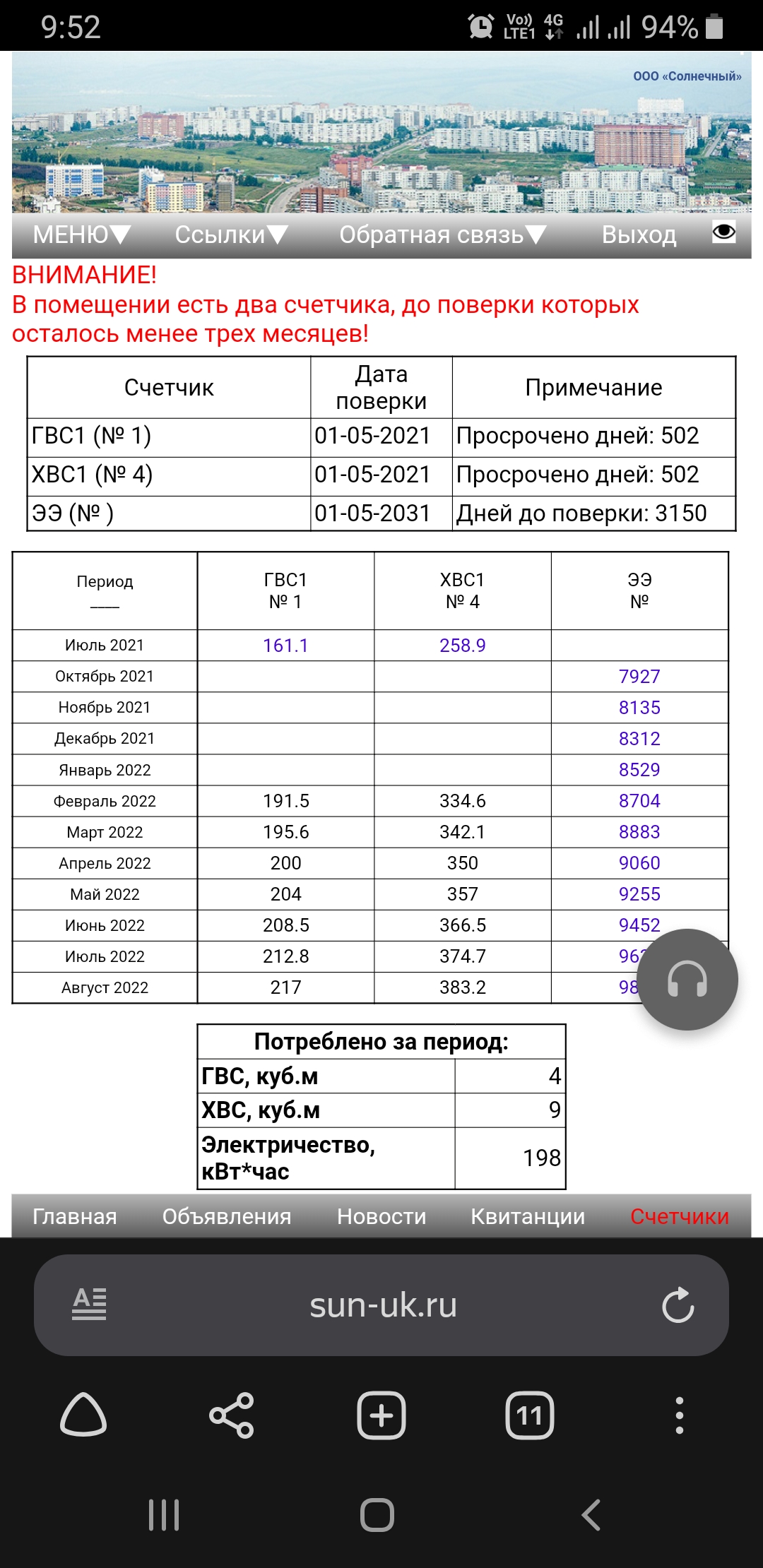 | Ответ:25-10-2018(17:38)Отвечено Здравствуйте, Уважаемый собственник! Данная информация не является актуальной. Поверка счетчиков у Вас ещё не скоро. К следующему периоду передачи показаний постараемся это убрать. /> Когда действительно наступит время поверки индивидуальных приборов учета, мы обязательно уведомим Вас об этом, разместив объявление на сайте в разделе "Объявления" и на информационной доске в подьезде. С Уважением, ООО "Солнечный". | ||||||||